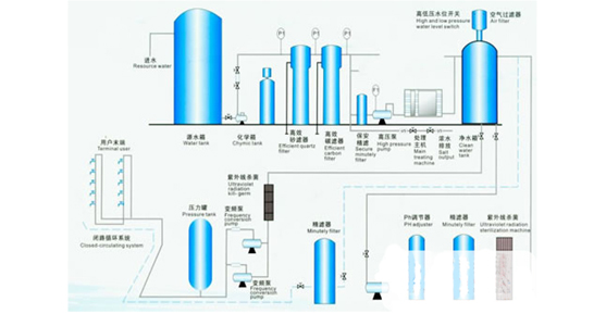 自來水(或其他水源) → 一級水處理 → 二級水處理 → 三級水處理 → 精處理 → 膜分離系統(tǒng) → 殺菌消毒 → 用戶