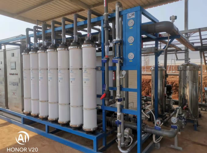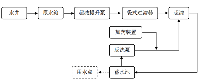 水處理設(shè)計(jì)額定出水量為50m³/h,原水為井水,經(jīng)過袋式過濾器、超濾處理后,進(jìn)蓄水池儲存,超濾產(chǎn)水經(jīng)過水泵增壓后送至廠區(qū)。