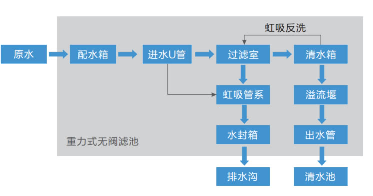 重力式無(wú)閥濾池由分配水槽、進(jìn)水管、過(guò)濾室、集水區(qū)、連通管、沖洗水箱、溢流槽、虹吸上升管、虹吸下降管、虹吸輔助管、抽氣管、排水水封箱、虹吸破壞管、虹吸破壞斗、強(qiáng)制虹吸裝置、強(qiáng)制破壞裝置等組件構(gòu)成,是集水力學(xué)、結(jié)構(gòu)學(xué)、空氣動(dòng)力學(xué)為一體的凈化水裝置。