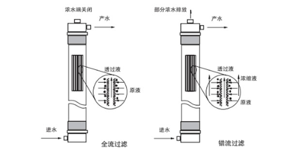 在超濾過程中,水溶液在壓力推動(dòng)下,流經(jīng)膜表面,小于膜孔的溶劑(水)及小分子溶質(zhì)透水膜,成為凈化液(濾清液),比膜孔大的溶質(zhì)被截留,隨水流排出,成為濃縮液。超濾運(yùn)行有全流過濾 (死端過濾) 和錯(cuò)流過濾兩種模式。全流過濾時(shí),進(jìn)水全部透過膜表面成為產(chǎn)水;而錯(cuò)流過濾時(shí),部分進(jìn)水透過膜表面成為產(chǎn)水,另一部分則夾帶雜質(zhì)排出成為濃水。全流過濾能耗低、操作壓力低,因而運(yùn)行成本更低;而錯(cuò)流過濾則能處理懸浮物含量更高的流體。 具體的操作形式宜根據(jù)水中的懸浮物含量來確定。