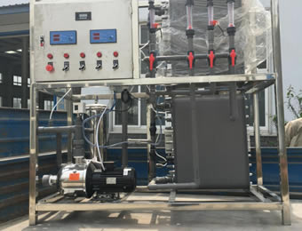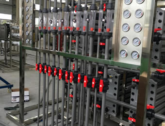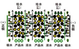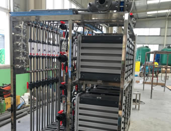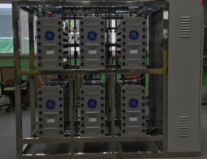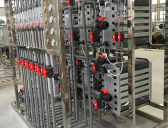 EDI技術(shù)將電滲析和離子交換技術(shù)巧妙的結(jié)合在一起。淡水進(jìn)入淡水室后,淡水中的離子與樹脂發(fā)生離子交換從水中脫離;被交換的離子受電性遷引作用,陽離子穿過陽離子交換膜向陰極遷移,陰離子穿過陰離子交換膜向陽極遷移,并進(jìn)入濃水室從而從淡水中去除。離子進(jìn)入濃水室后,由于陽離子無法透過陰離子交換膜,因此其將被截留在濃水室,同樣,陰離子也無法透過陽離子交換膜,被截留在濃水室,這樣陰陽離子將隨濃水流被排出模塊;這樣淡水中的離子被不斷的去除,淡水的純度將越來越高。水分子在電的作用下被不斷的離解為H+和OH-,H+和OH-將分別使得被消耗的陽/陰樹脂連續(xù)的再生。陽極處的氧化反應(yīng)產(chǎn)生O2、Cl2,陰極處的還原反應(yīng)產(chǎn)生H2。