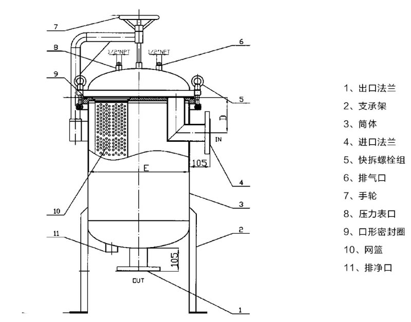 袋式過濾器是一種壓力式過濾裝置,主要有過濾筒體、過濾筒蓋和開啟機(jī)構(gòu)、加強(qiáng)網(wǎng)等主要部件組成。