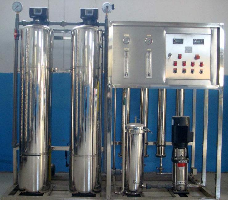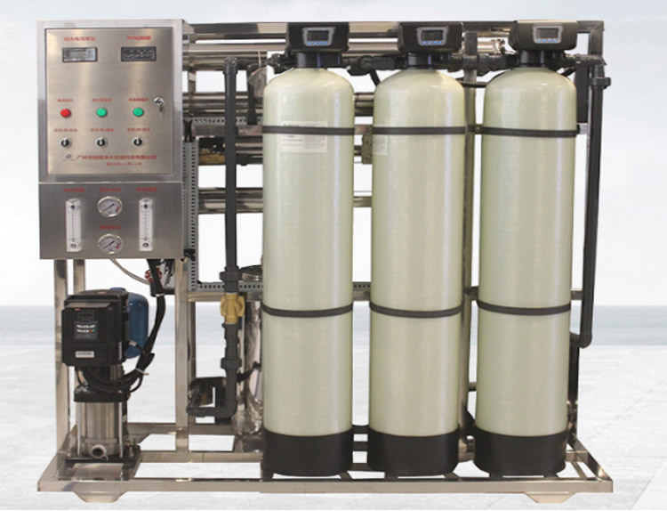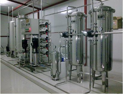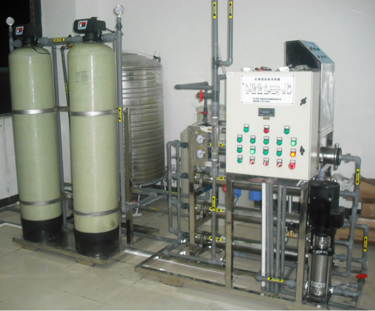 原水→原水箱→原水泵→石英砂過濾器→活性炭過濾器→阻垢劑裝置→精密過濾器→高壓泵→反滲透裝置→活凈水箱→變頻供水→刷卡取水