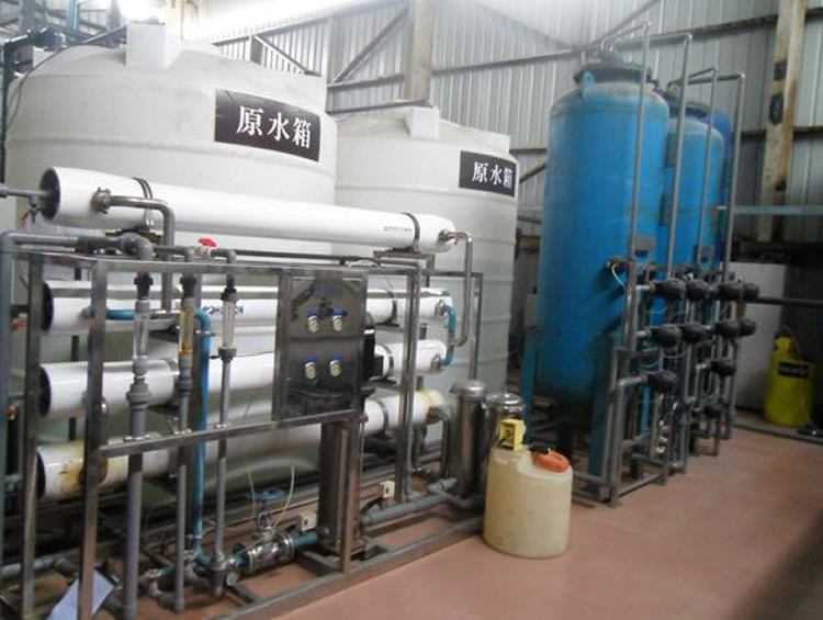 原水→原水加壓泵→多介質(zhì)過濾器→活性炭過濾器→軟水器→精密過濾器 →第一級(jí)反滲透→PH調(diào)節(jié)→中間水箱→第二級(jí)反滲透(反滲透膜表面帶正電荷)→純化水箱→純水泵→微孔過濾器→用水點(diǎn)