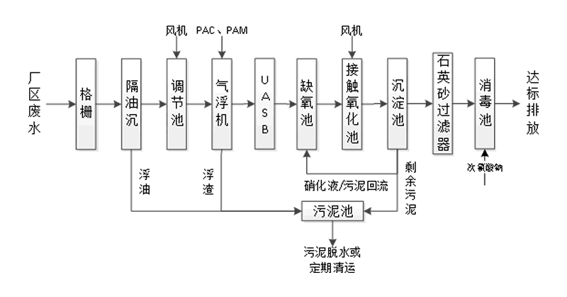 食品加工廢水的處理預(yù)處理部分主要包括:粗(細)格柵、沉砂池、隔油池、氣浮池、集水池、調(diào)節(jié)池和初沉池等。生化處理部分主要包括厭氧處理和好氧處理。一般采用的厭氧工藝為UASB和水解酸化;好氧工藝一般采用SBR工藝和生物接觸氧化技術(shù),有條件時亦可采用膜生物反應(yīng)器工藝。