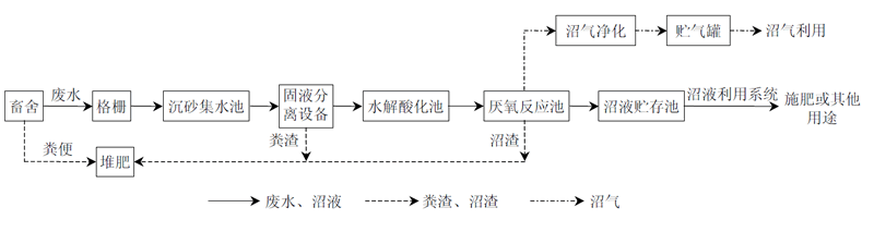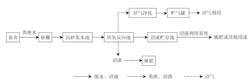 適用于能源需求不大,主要以進行污染物無害化處理、降低有機物濃度、減少沼液和沼渣消納所需配套的土地面積為目的,且養(yǎng)殖場周圍具有足夠土地面積全部消納低濃度沼液,并且有一定的土地輪作面積的情況。