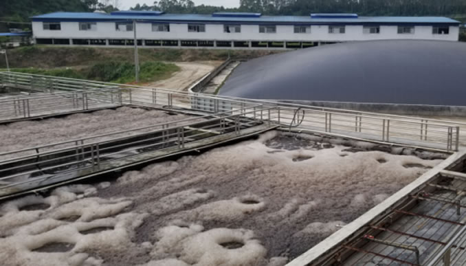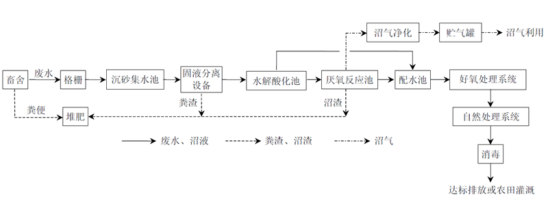 養(yǎng)殖廢水主要來源于養(yǎng)殖畜禽尿液,殘余糞便,飼料殘渣以及沖洗水和部分生活污水。養(yǎng)殖廢水水質(zhì)水量變化大,懸浮物多,有機物濃度高,氨氮含量高,含有重金屬和致病菌并伴有惡臭。養(yǎng)殖廢水中的污染物主要以固態(tài),溶解態(tài)的有機物形式存在,使廢水BOD,COD,SS和色度等含量很高,污染物可生物降解性好,此外廢水中含有N,P等營養(yǎng)物質(zhì),廢水中的固體殘渣主要是有機物質(zhì)。因此,養(yǎng)殖廢水先采用物理預(yù)處理進行固液分離,然后經(jīng)厭氧處理將大分子有機物質(zhì)分解成小分子物質(zhì),再經(jīng)過好氧處理進一步去除有機污染物,最后經(jīng)消毒出水達標排放。