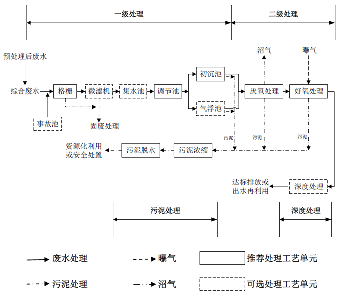 一級(jí)處理指以沉淀、氣浮等固液分離措施為主體的初級(jí)凈化過程,以減輕后續(xù)處理工藝負(fù)荷;二級(jí)處理主要指生化處理工藝;深度處理為根據(jù)不同處理要求采用更進(jìn)一步的處理過程。