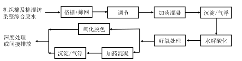 (1)機(jī)織棉及棉混紡染整綜合廢水常規(guī)處理宜采用前物化+生化+后物化組合工藝