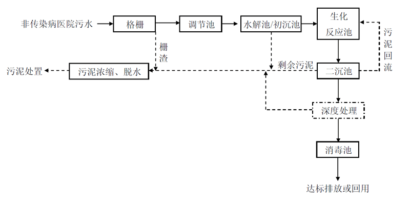 (2)出水直接或間接排入地表水體、海域、或出水回用的非傳染病醫(yī)院污水,一般采用二級處理+(深化處理)+消毒工藝